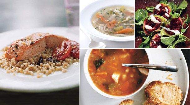 Recipes for Healthy Foods that Fight the Flu: Wild Salmon with Pearl Couscous, Hearty Chicken Vegetable Soup, Chicken and White Bean Soup, and Fig Salad with Goat's Milk Yogurt